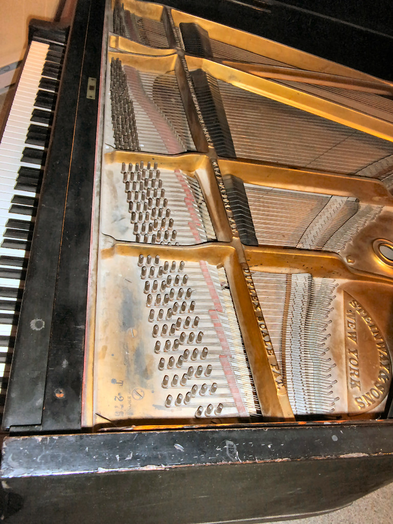 The piano is currently in general working order. This means that all parts of the lower and upper action, along with the trapworks are functioning. The tuning pins have good holding power, and the strings still produce good tone. This instrument could very well, in our opinion, be a good entry point for one who wishes access to a very high quality instrument and would plan to later have the instrument rebuild (to maximize its full playing capabilities).