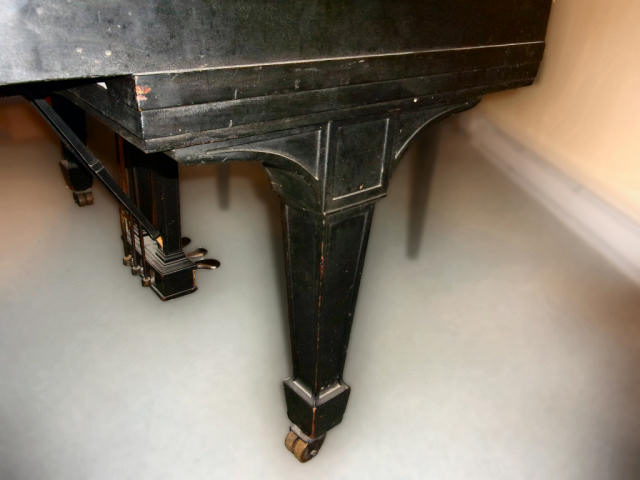 The piano has had much wear. The shellac finish is missing in some areas (mostly edges), along with discolored rings left by items that at one time had been set on the lid. The instrument (at minimal) should be thoroughly cleaned.