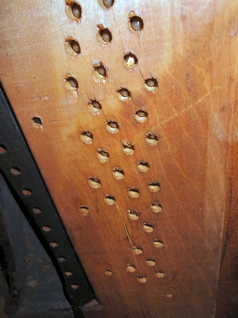 We did find, what appeared to be some minor surface cracks in the pin block along with one slightly larger crack. None of these appeared to be causing any problems for the tuning pins. All tuning pins appeared to be well capable of keeping tension.