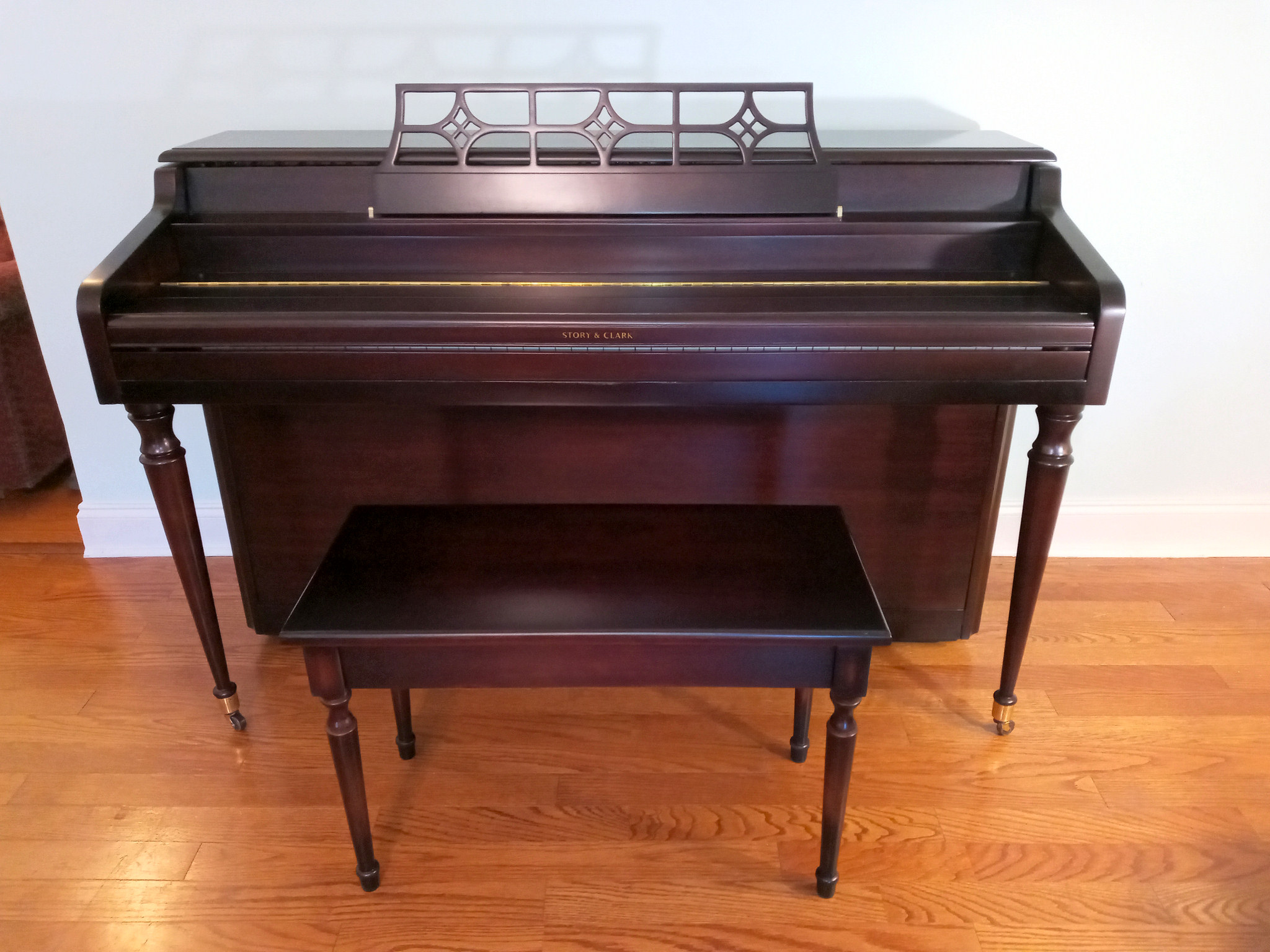 Piano has been refinished in our Heirloom style. Rich browns with highlights.