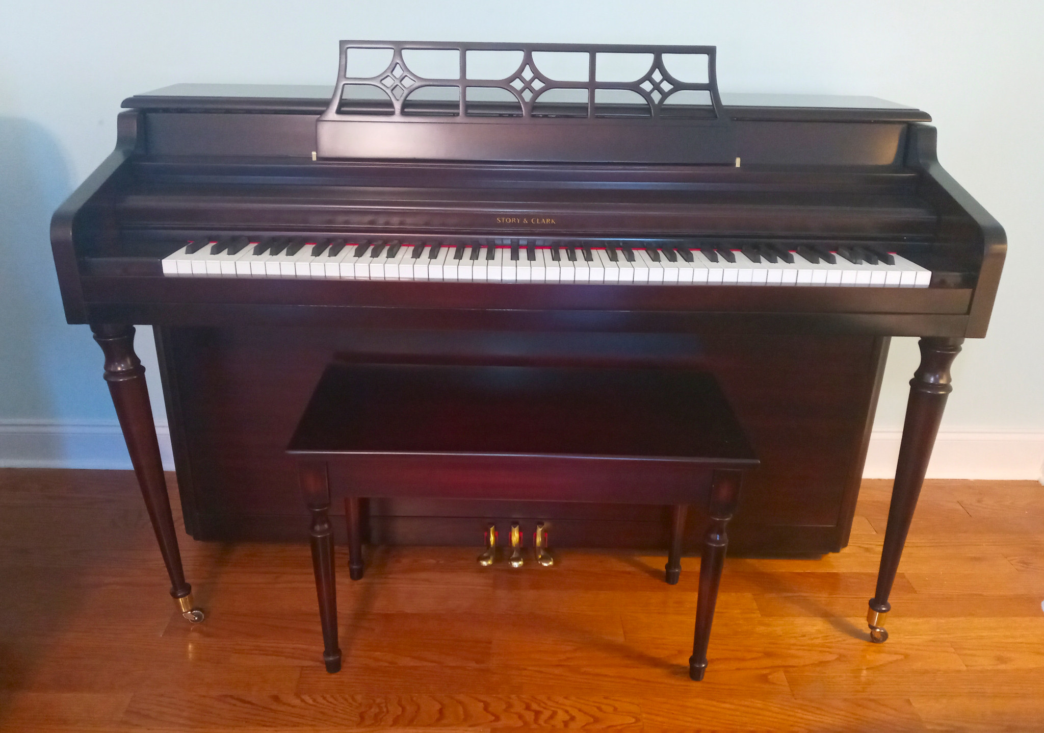 New tuning pins and strings have been installed along with new action felts, new dampers, springs, resurfaced hammers, and fully regulated to manufacturer's specifications.