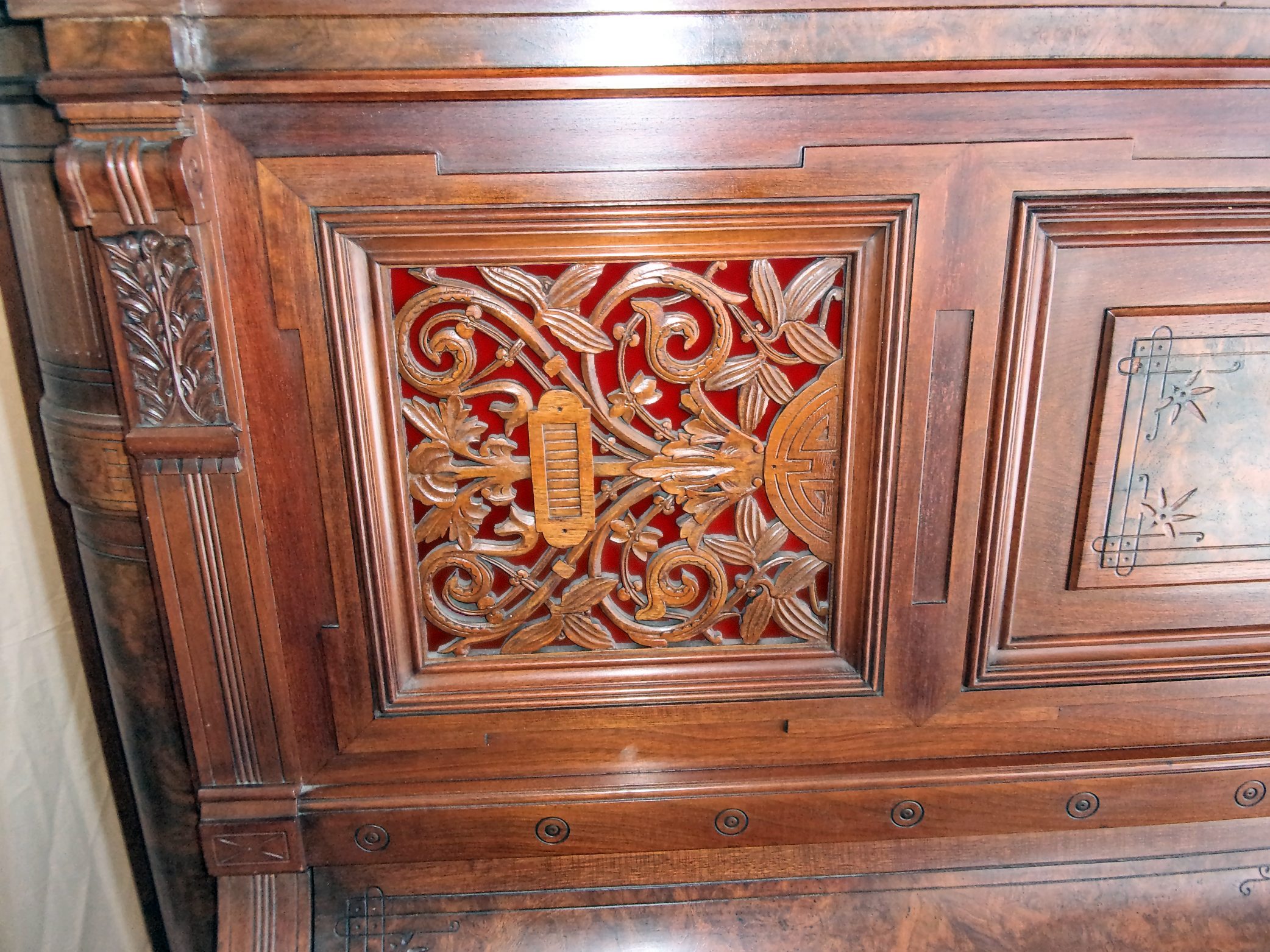 Photos of this Piano The Wm. Knabe decal on the burl fallboard. The piano is richly embellished using burl throughout along with fine carvings. The round pillar corners extend all the way up the sides and are reflected in the shape of the lid. The music shelf folds down for use.